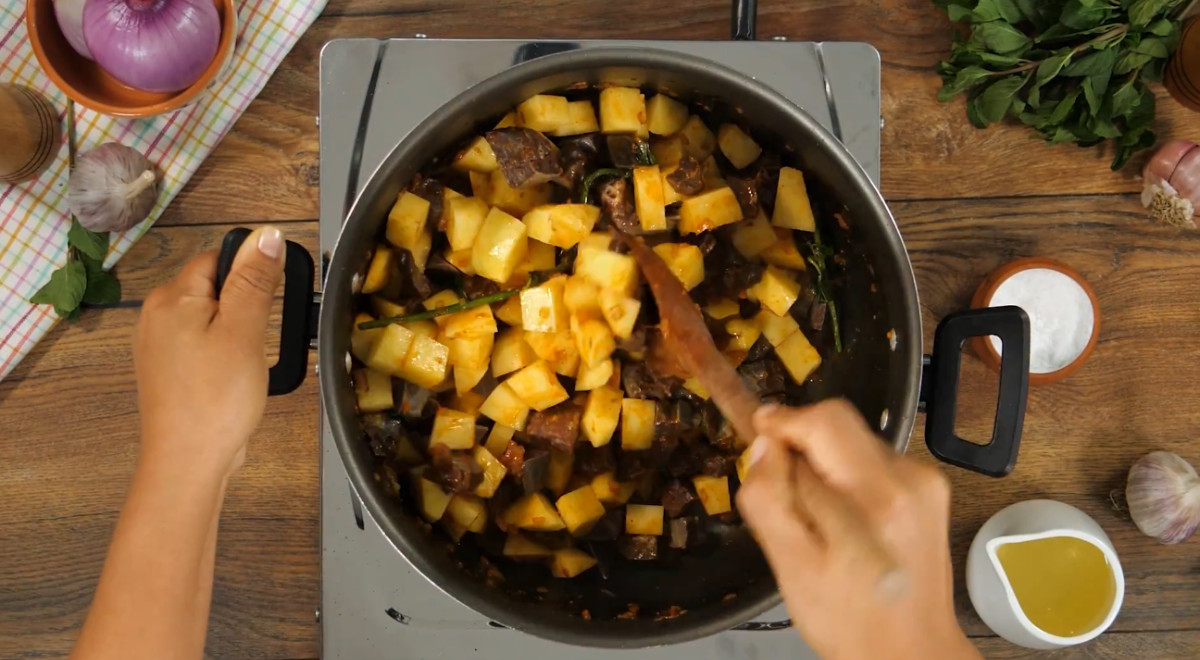 - Agregar una rama de hierbabuena, el bofe, la papa blanca cortada en cubos y el caldo de bofe. Mezclar.