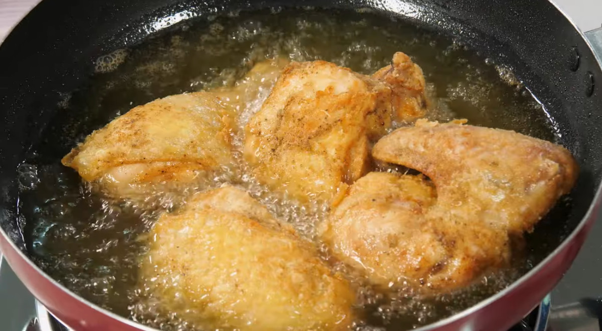 - Sazonar las presas de pollo con sal, pimienta y comino, pasarlas por harina y freírlas en aceite caliente hasta que queden cocidas. Reservar.