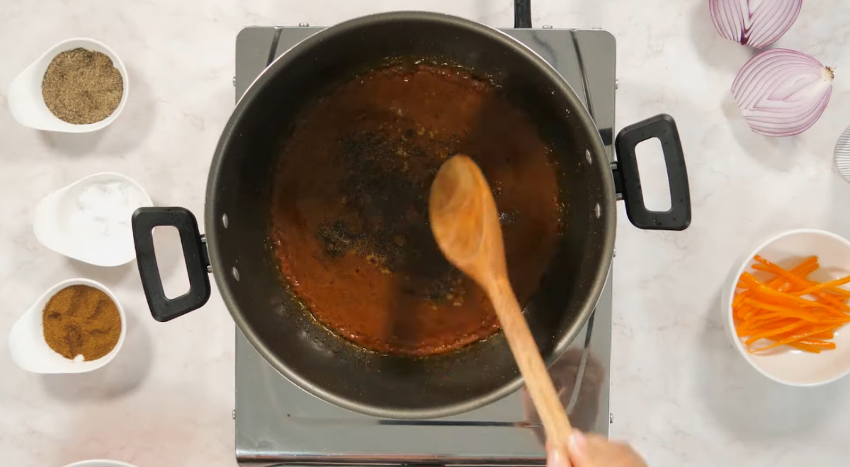 - Añadir el ají panca y el ají amarillo molido, sazonar con sal, pimienta y comino. Cocinar a fuego bajo de 8 a 10 minutos.