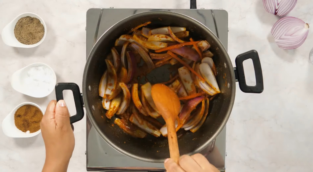 - Agregar la cebolla, el ají amarillo en tiras, las hojas de laurel, el vinagre tinto y el caldo de pollo. Cocinar hasta que las cebollas estén suaves.
