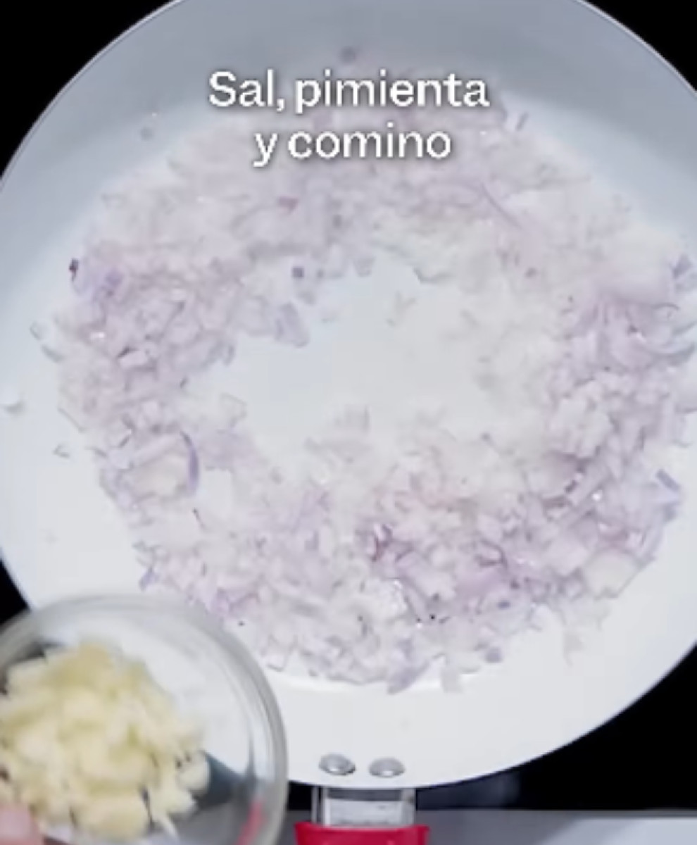- Cuando la cebolla se haya tornado traslúcida, agregar los ajos picados y sazonar con sal, pimienta y comino.