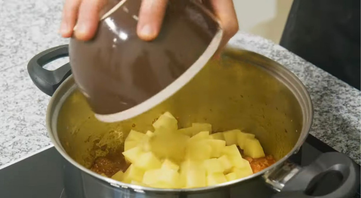 - Agregar las papas, mezclar bien y verter el caldo. Cocinar de 12 a 15 minutos.