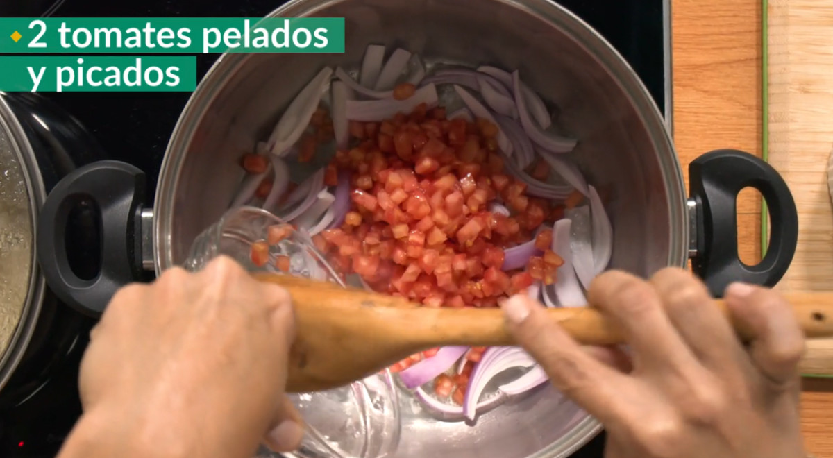 - Agregar el tomate. Mezclar.