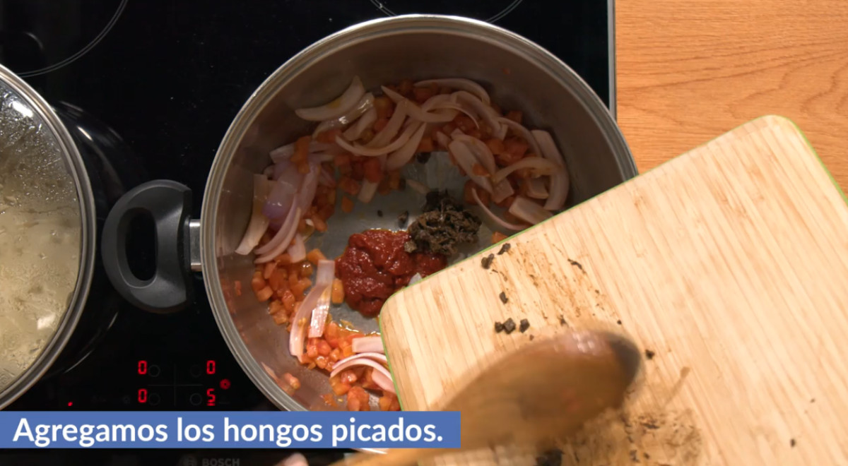 - Añadir el ají panca, los hongos, el laurel y la pasta de tomate.