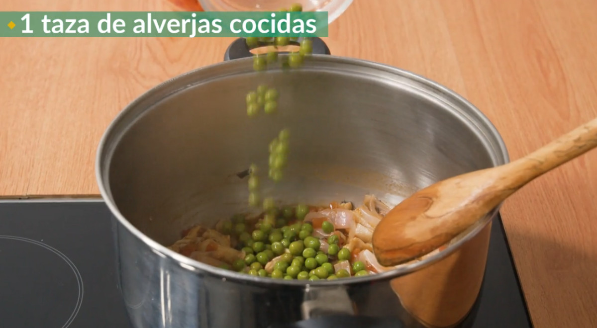 - Agregar la zanahoria, las alverjas y el caldo de mondongo. Mezclar.