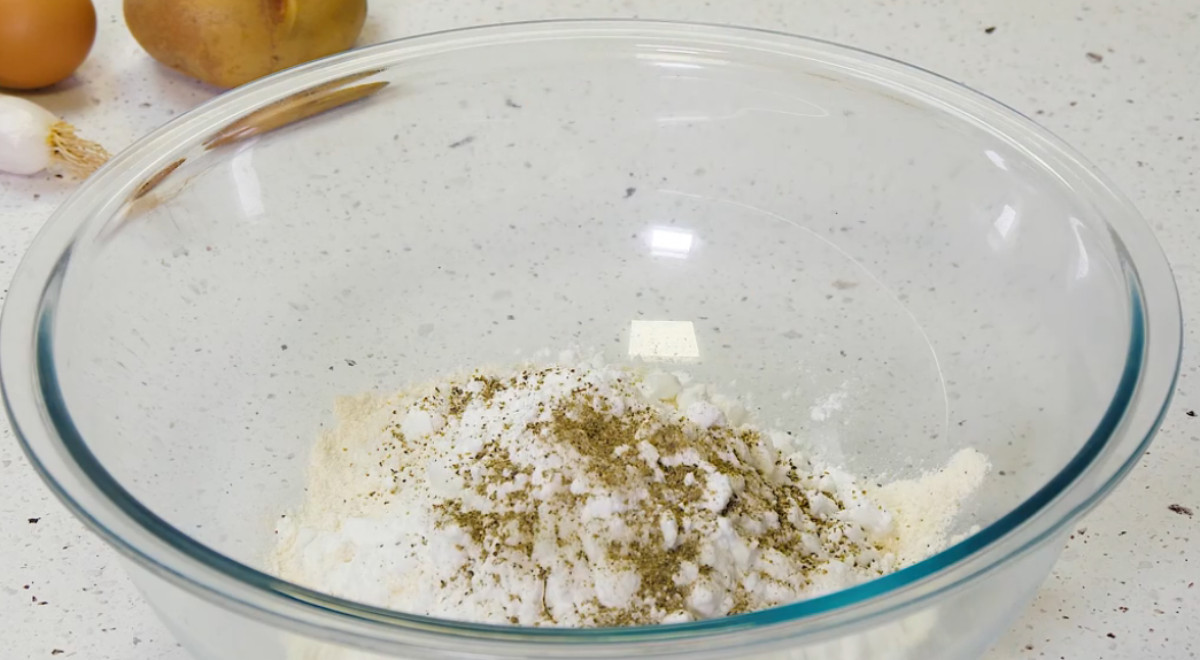- Colocar la harina y el chuño en un bowl grande. Salpimentar.