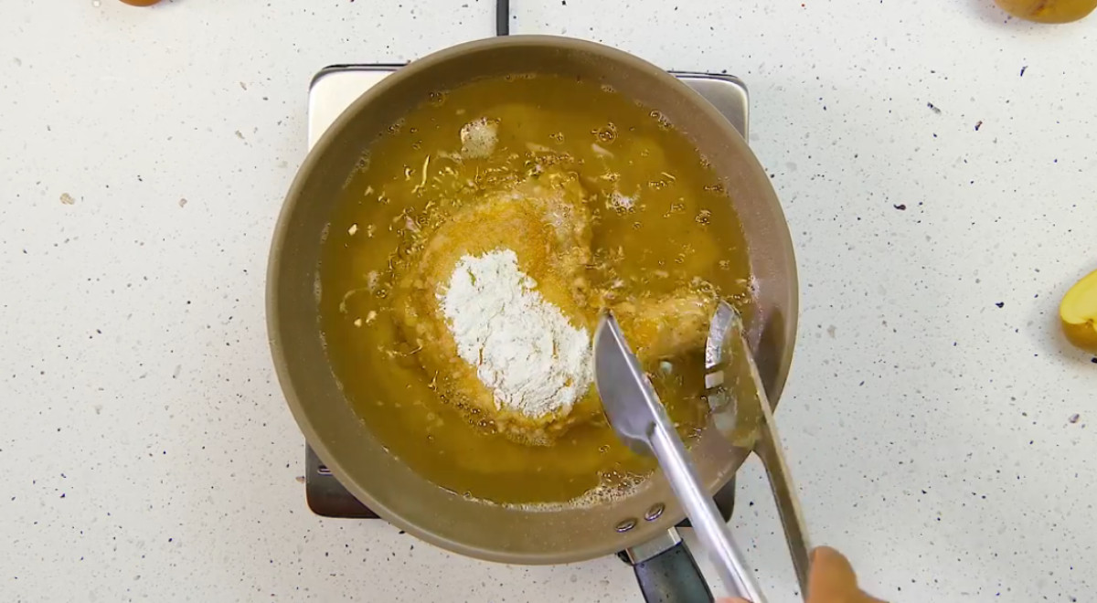 - Inmediatamente, freír el pollo en aceite bien caliente.