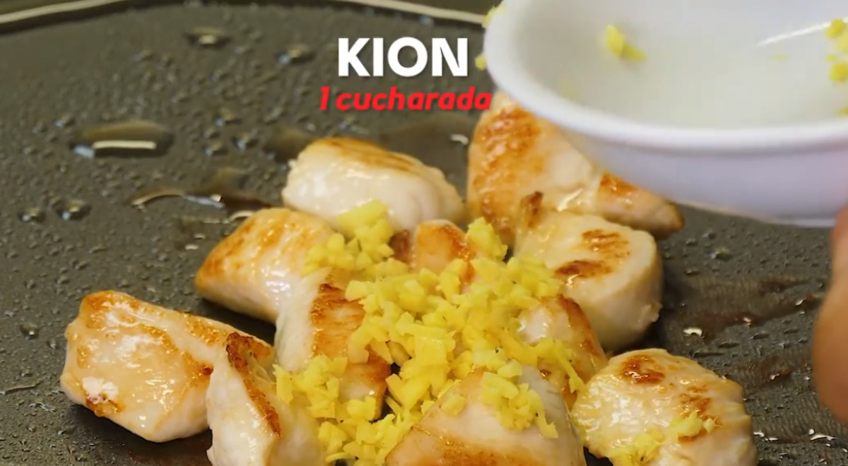 - Añadir sal al pollo en cubos. Freírlo en una sartén con poco aceite. Agrega el kion y mover.