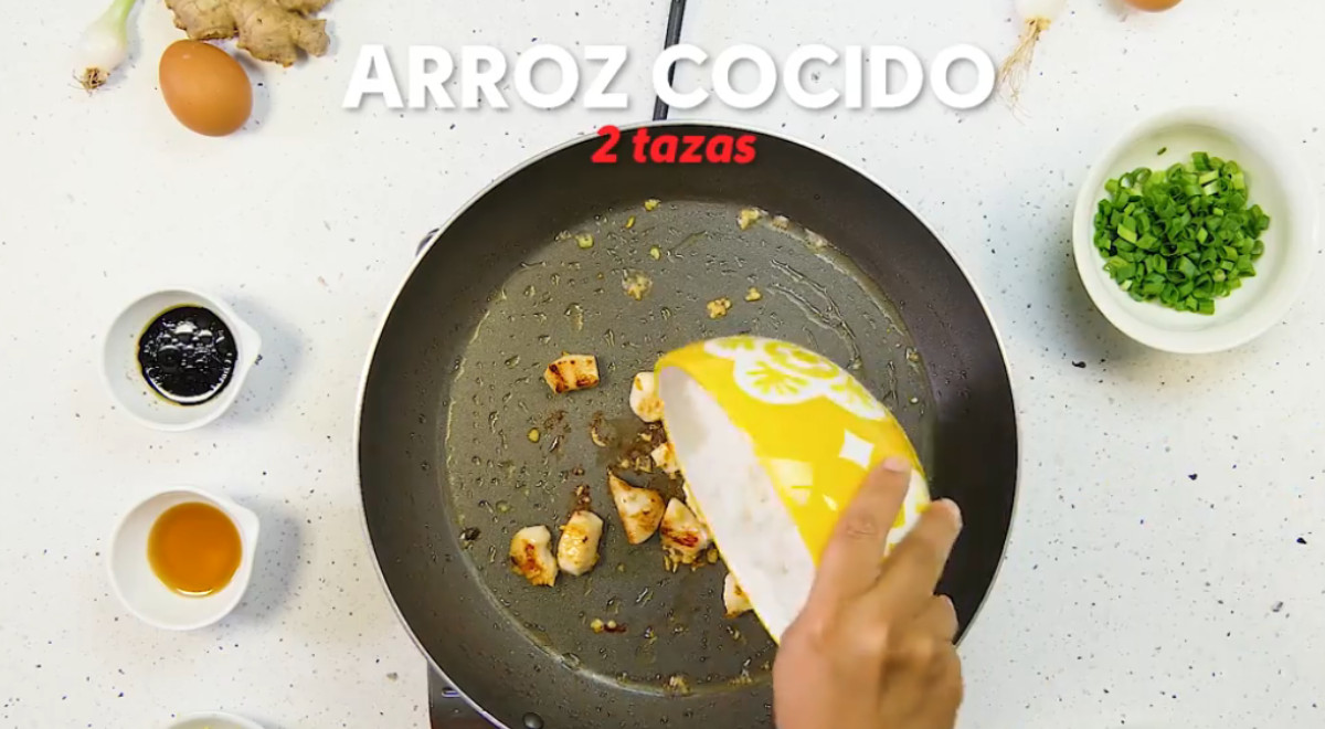 Lleva arroz, pollo, kion, sillao, cebolla china, aceite de ajonjolí y huevo.