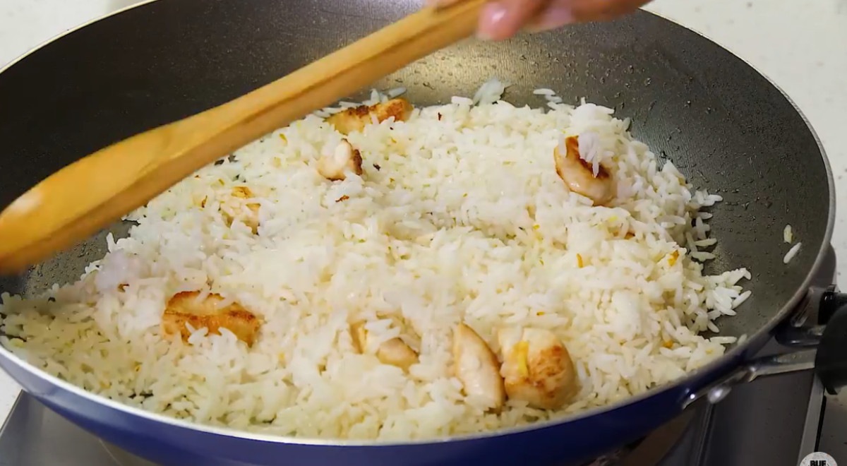 - Agregar el arroz y continuar salteando.