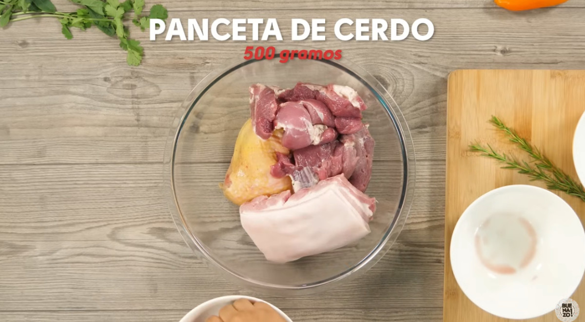 6 a 8 porciones- Colocar el pollo, el cordero y la panceta de cerdo en un bowl.