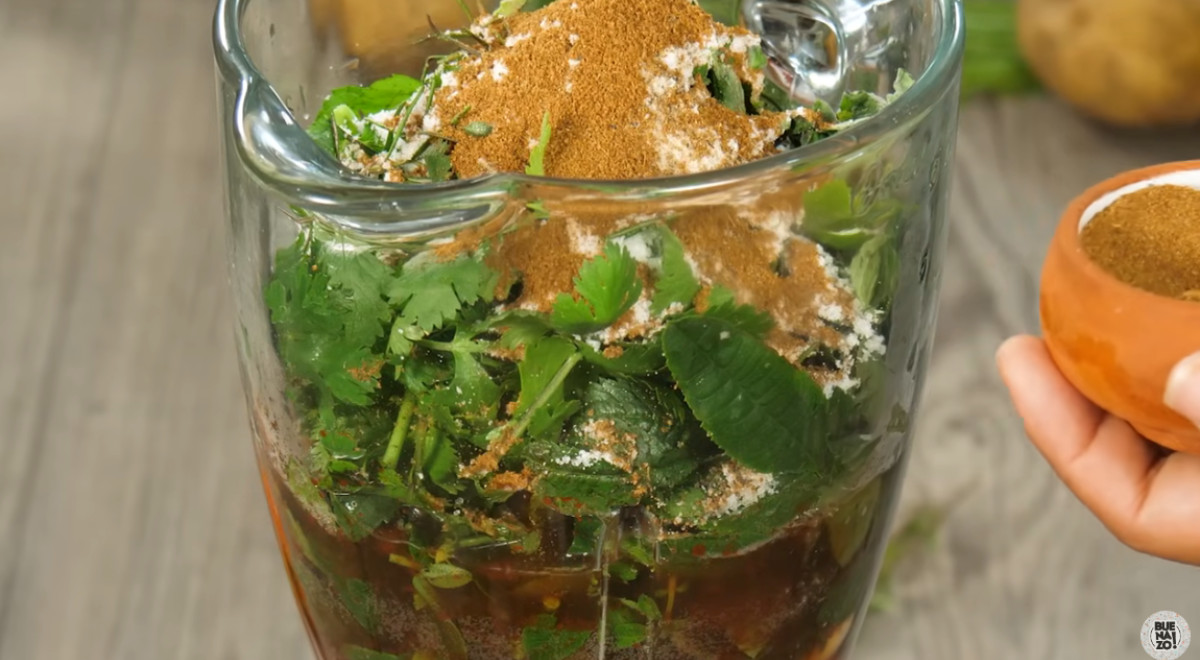 - Agregar en la licuadora la chicha de jora, la cerveza negra, el vinagre tinto, el ají panca, el ají amarillo, el ajo, el chincho, el huacatay, la hierbabuena, el culantro, el romero, la muña, la sal, la pimienta y el comino al gusto. Licuar.