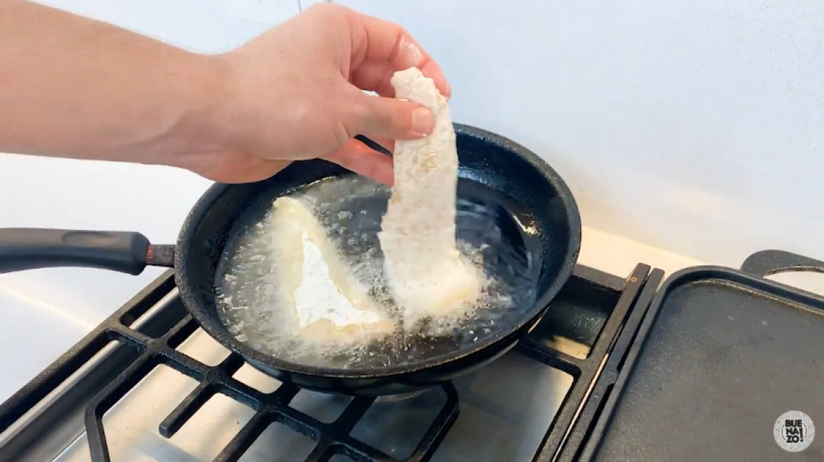 - Poner una sartén al fuego y echar aceite. Cuando el aceite esté caliente, colocar los filetes sazonados y freírlos hasta que queden cocidos y dorados. Una vez fritos, ponerlos sobre papel absorbente para quitar el exceso de grasa.