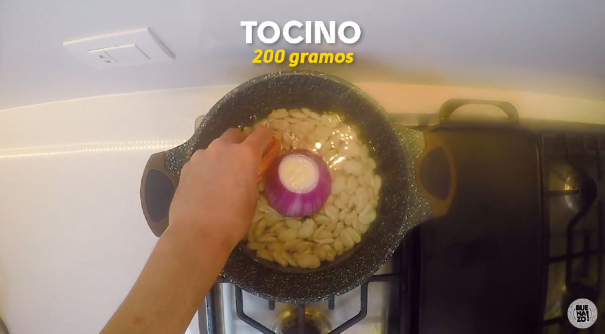 - Desechar el agua del remojo, enjuagar los pallares y ponerlos en una olla. Cubrir con agua hasta dos o tres dedos por encima de los pallares. Agregar una cebolla entera y el tocino. Llevar la olla al fuego y cocinar de 35 a 40 minutos, revolviendo de vez en cuando.
