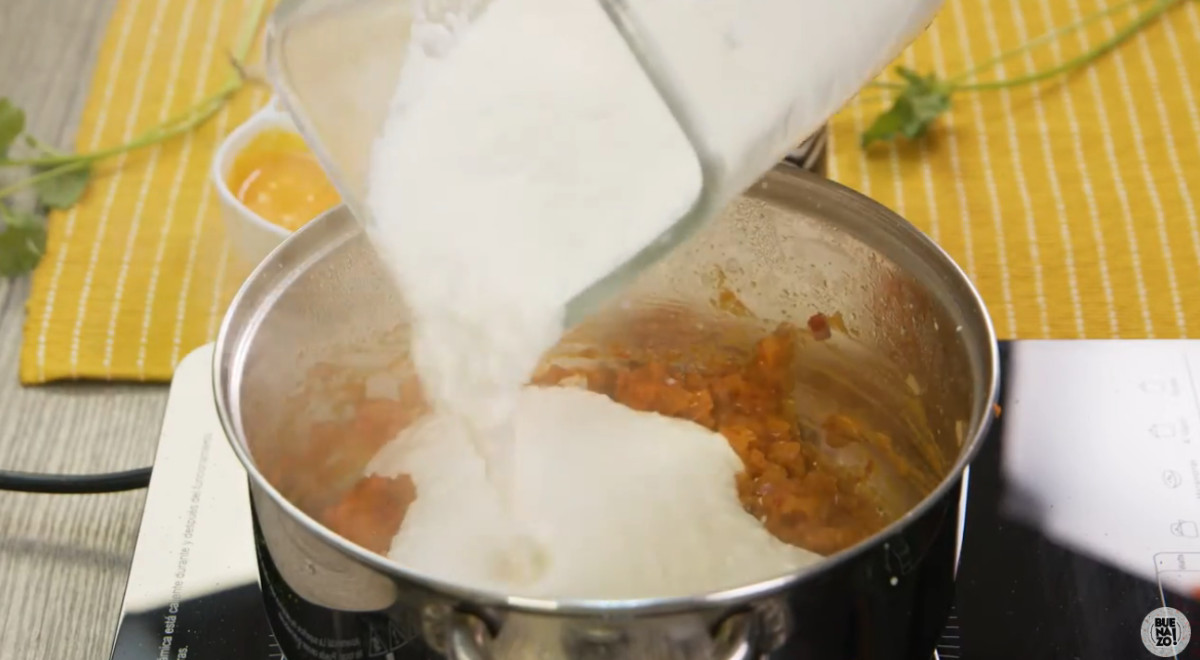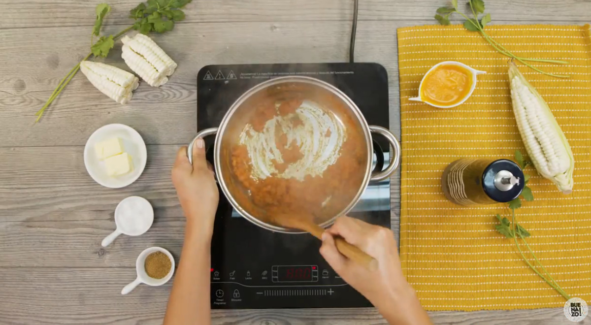 Cuando el aderezo esté listo, añadir los choclos licuados. Sazonar con sal, pimienta y comino.