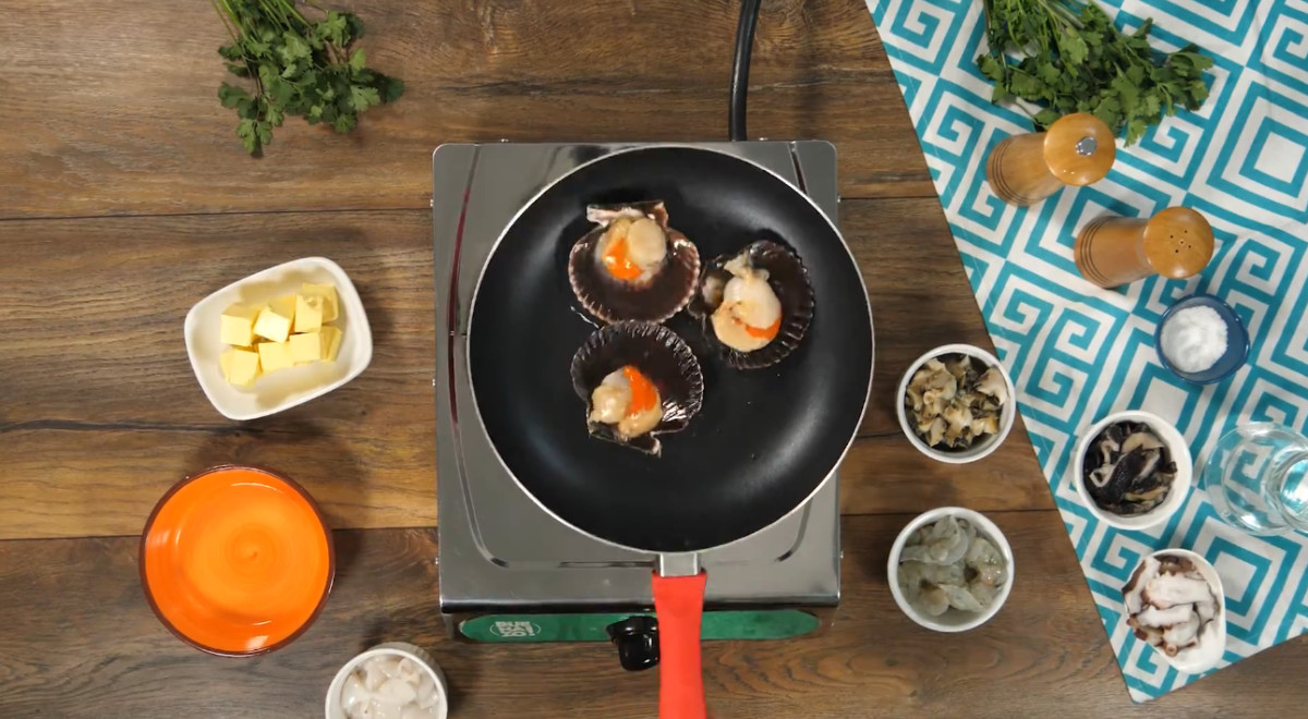 - Limpiar el pescado y los mariscos. Precocer el pulpo, el caracol y la lapa. En una sartén a fuego medio, saltear las conchas de abanico con 1 cucharada de aceite y 1 cucharada de pisco. Reservar.