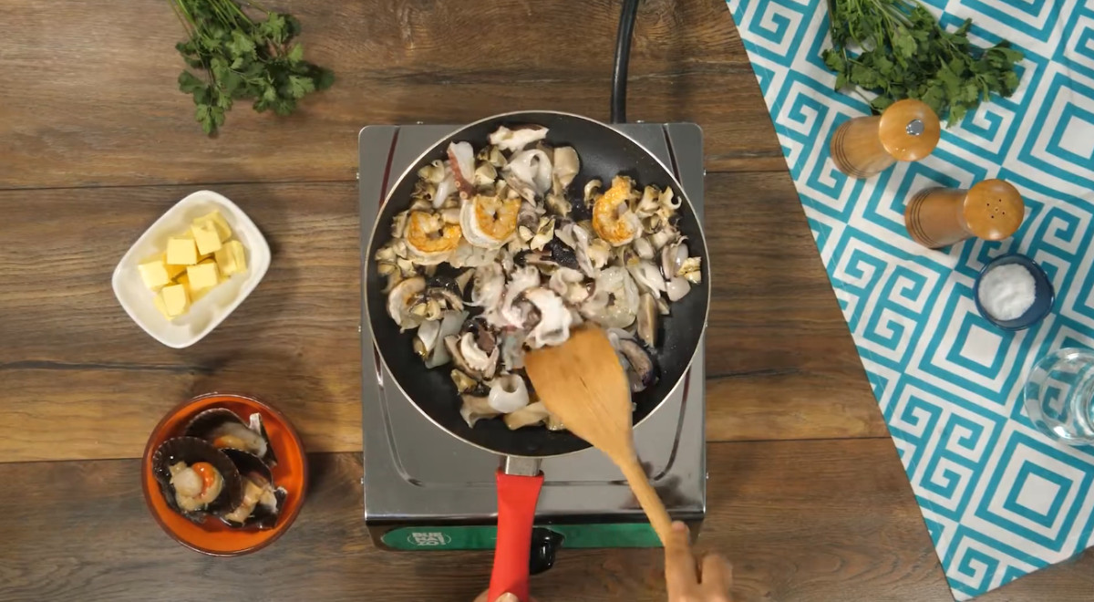 - En otra sartén a fuego medio, agregar ½ cucharada de aceite y 1 cucharada de mantequilla. Saltear los langostinos, el pulpo, la lapa, el caracol y el calamar con la mitad del vino blanco. Incorporar las conchas de abanico, mezclar y reservar.