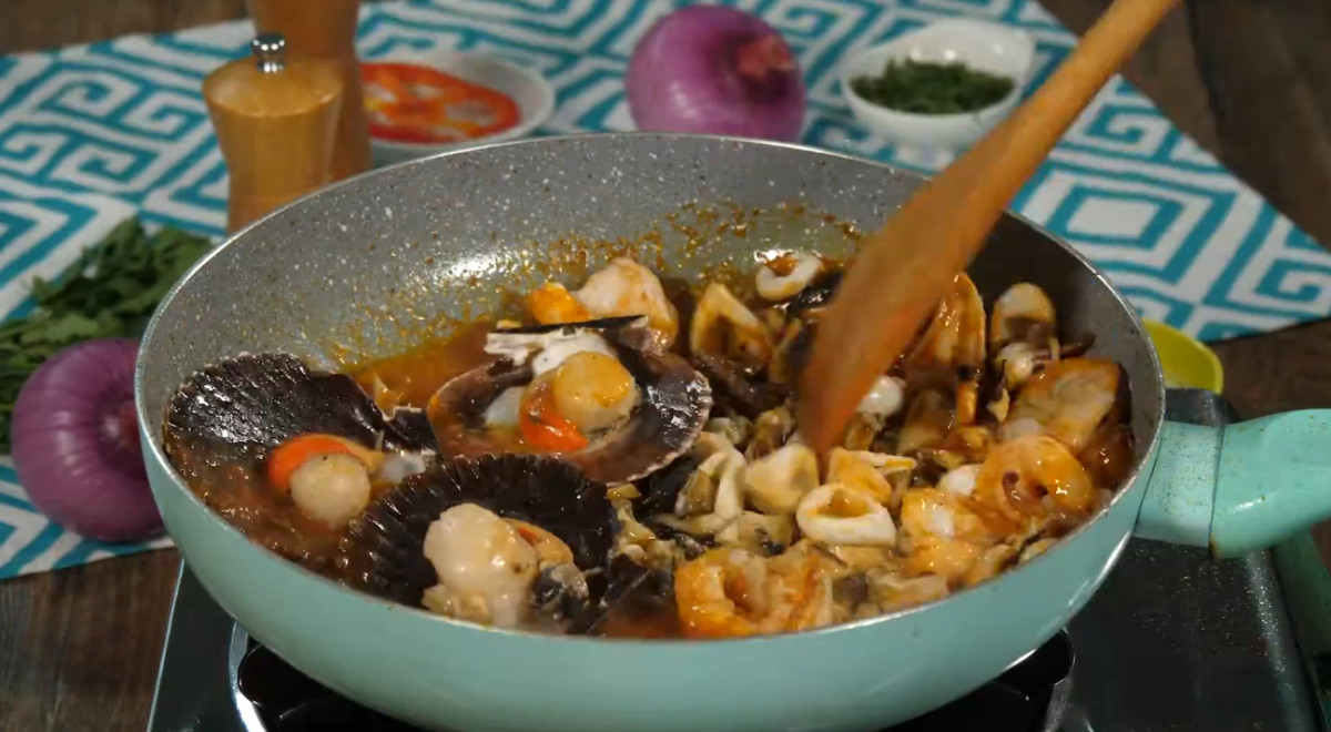 - Agregar al aderezo los mariscos reservados, el caldo de pescado y una rodaja de rocoto. Incorporar la crema de leche y culantro picado al gusto. Mezclar, rectificar la sazón y cocinar hasta que la salsa esté a punto. Reservar.