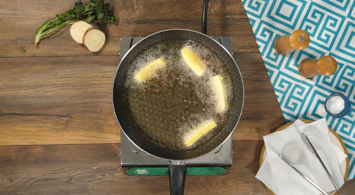 - Cocer las yucas en agua con sal, escurrir y freír en abundante aceite caliente hasta dorar. Hacer incisiones al pescado, sazonar con 2 cucharadas de ajo, sal y pimienta, pasar por harina sin preparar y freír en abundante aceite caliente.