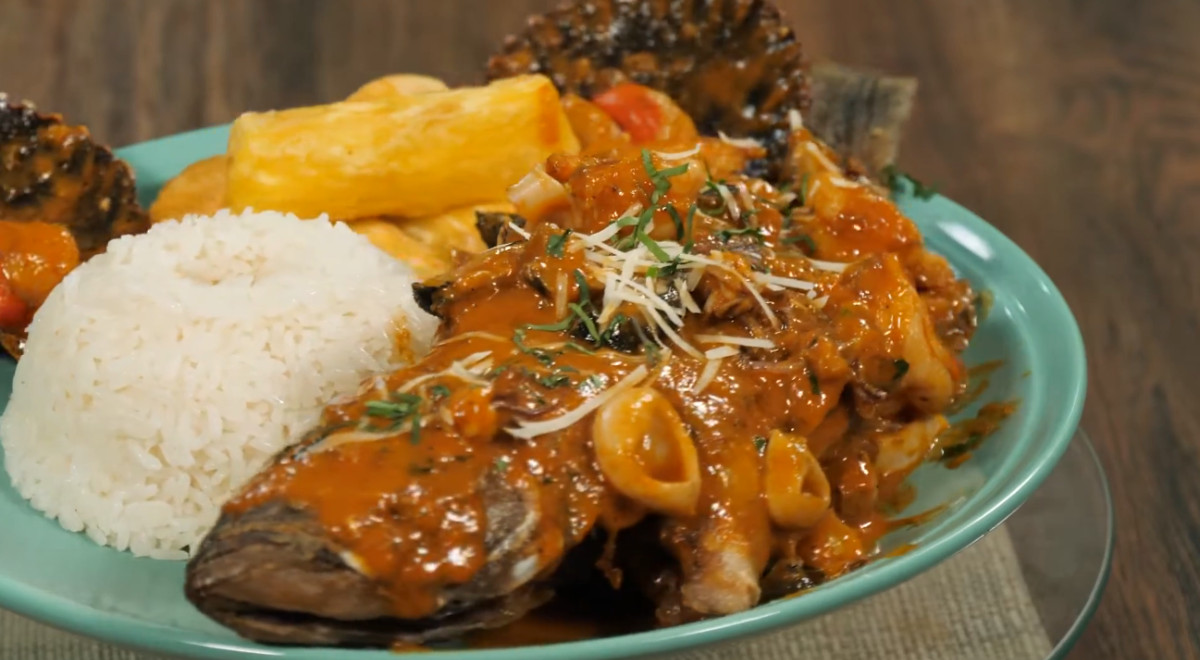 Esta receta se prepara con pescado, langostinos, calamar, pulpo, caracol, lapa, conchas de abanico, mantequilla, pisco, vino blanco, cebolla, ají amarillo, ají panca, pasta de tomate, caldo de pescado, rocoto, crema de leche, ajo molido, harina sin preparar, culantro, queso parmesano y yuca.