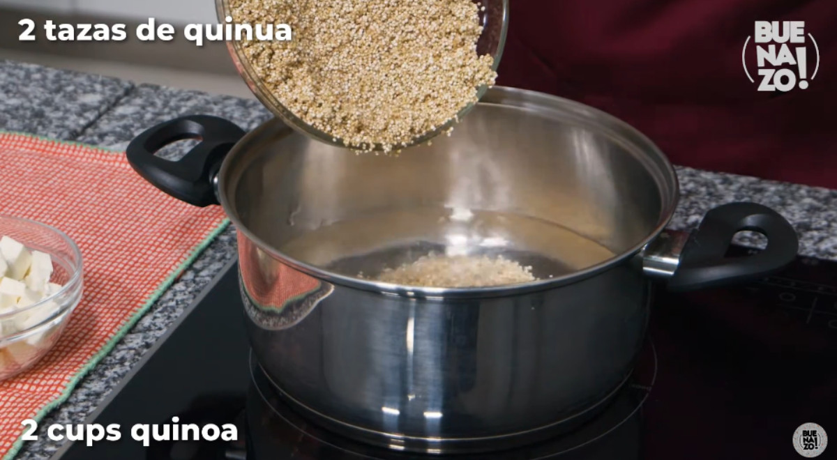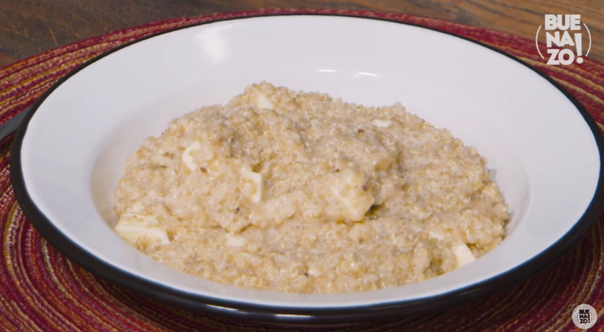 Esta receta lleva quinua, agua, mantequilla, leche evaporada, queso fresco, semillas de anís y sal.