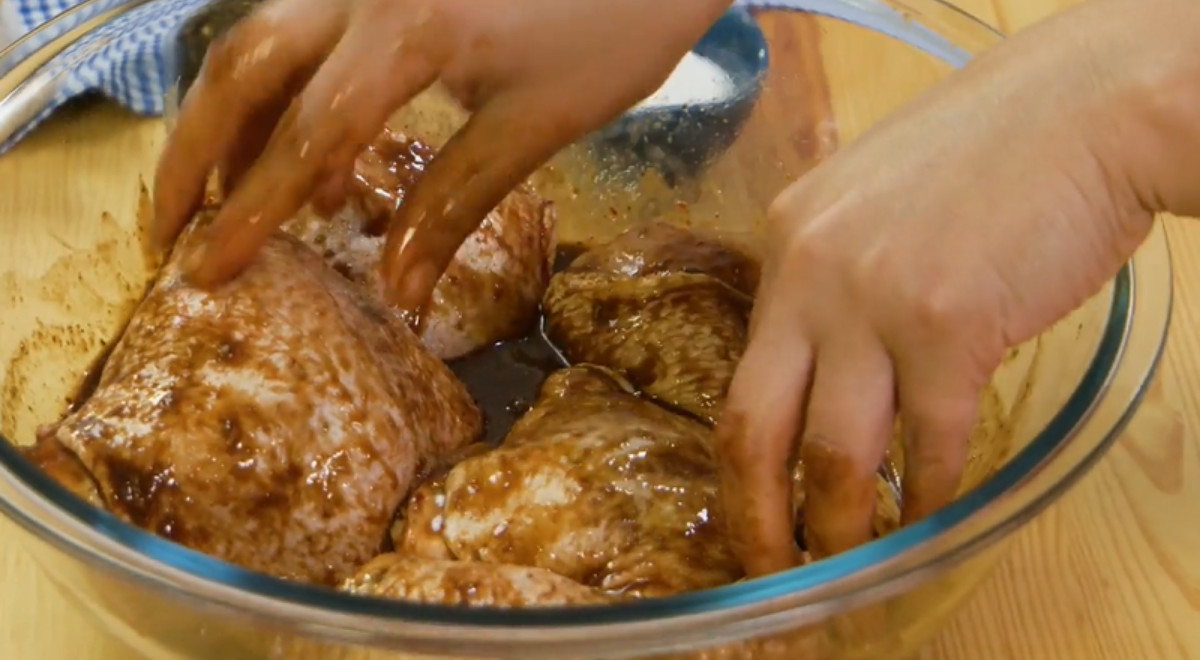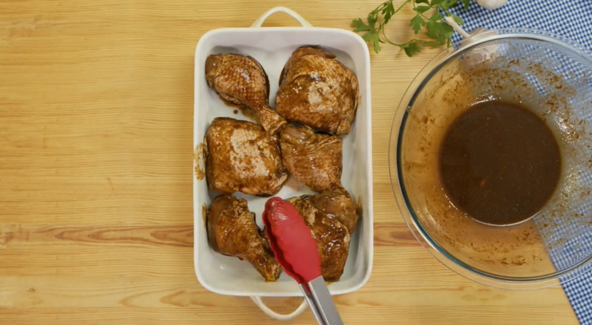 Primero se sumergen las presas de pollo en una mezcla de sillao, ají panca, vinagre tinto, mostaza, orégano, pimienta, comino y sal. Luego se deja marina en el rerfigerador para luego llevarlo al horno por 45 minutos. Sigue el paso a paso en la primera parte de esta receta.
