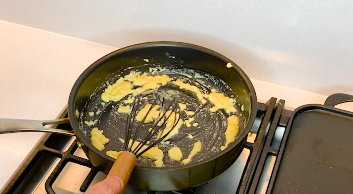 - En una sartén o una olla pequeña, derretir la mantequilla a fuego medio-bajo. Agregar la harina e integrarla bien a la mantequilla. Cocinar esta mezcla por un par de minutos, sin dejar de revolver, cuidando que no se queme.
