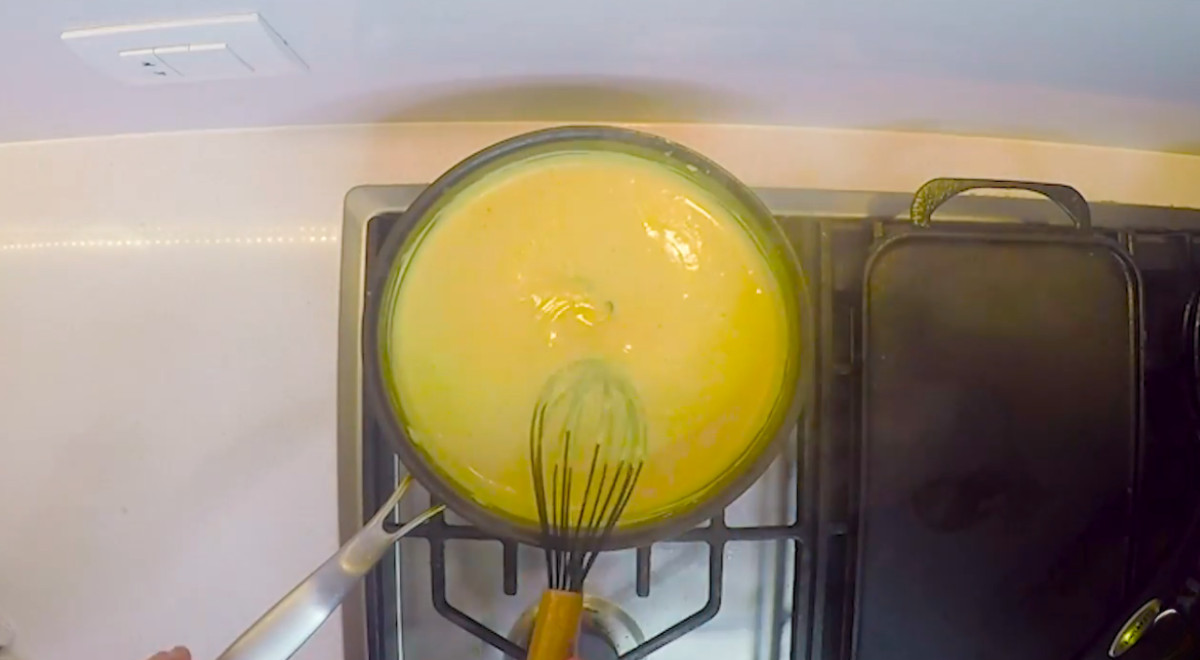 - Enseguida, echar poco a poco la leche evaporada y batir de 5 a 6 minutos o hasta obtener una salsa espesa. Sazonar con 1 cucharadita de sal, ½ cucharadita de pimienta y ½ cucharadita de nuez moscada rallada. Agregar los dos tipos de mostaza y el caldo de pollo. Integrarlos bien a la salsa. Tapar la sartén o la olla y dar un hervor. Apagar el fuego.