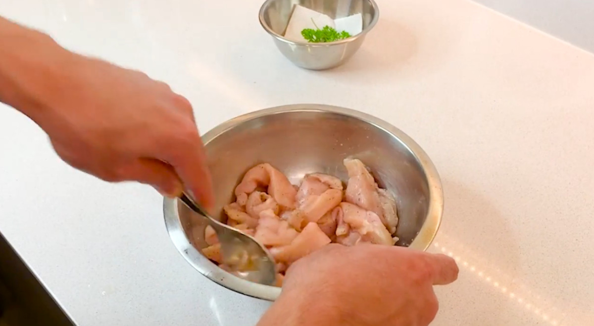 - Cortar la pechuga de pollo en filetes. Sazonarlos con 1 cucharadita de sal, ½ cucharadita de pimienta y ½ cucharadita de comino. Agregar 4 dientes de ajo enteros y mezclarlos bien con los filetes para que absorban el sabor del ajo.