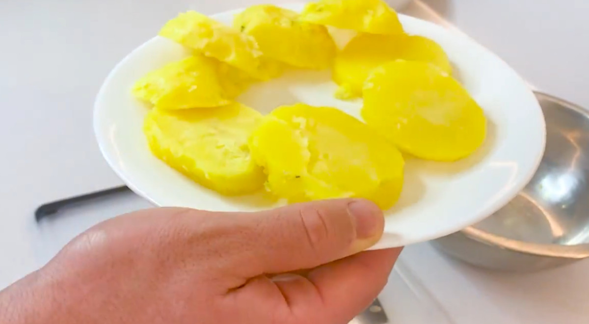 - Echar suficiente agua en una olla, añadir 1 ½ cucharadas de sal y mezclar bien. Agregar las papas amarillas y cocinar de 15 a 20 minutos o hasta que estén cocidas. Luego, pelarlas y cortarlas en rodajas.