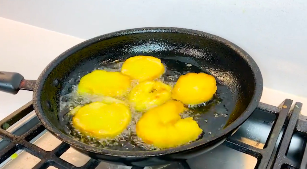 - Freír las rodajas de papa en una sartén con aceite caliente. Hacia el final de la fritura, echar 1 cucharada de mantequilla.