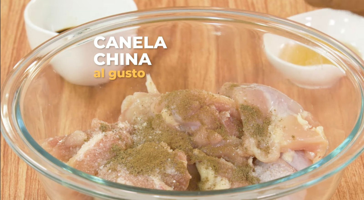 2 porciones- Cortar las piernas con encuentro en trozos medianos. Sazonar con sal, pimienta, canela china, dos cucharadas de sillao, una cucharada de salsa de ostión y dos cucharaditas de aceite de ajonjolí. Dejar marinar por unos minutos.