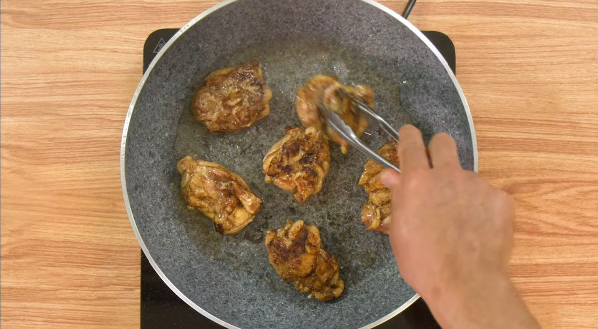 - Calentar un chorro de aceite en una sartén. Dorar los trozos de pollo por ambos lados. Retirar y reservar.