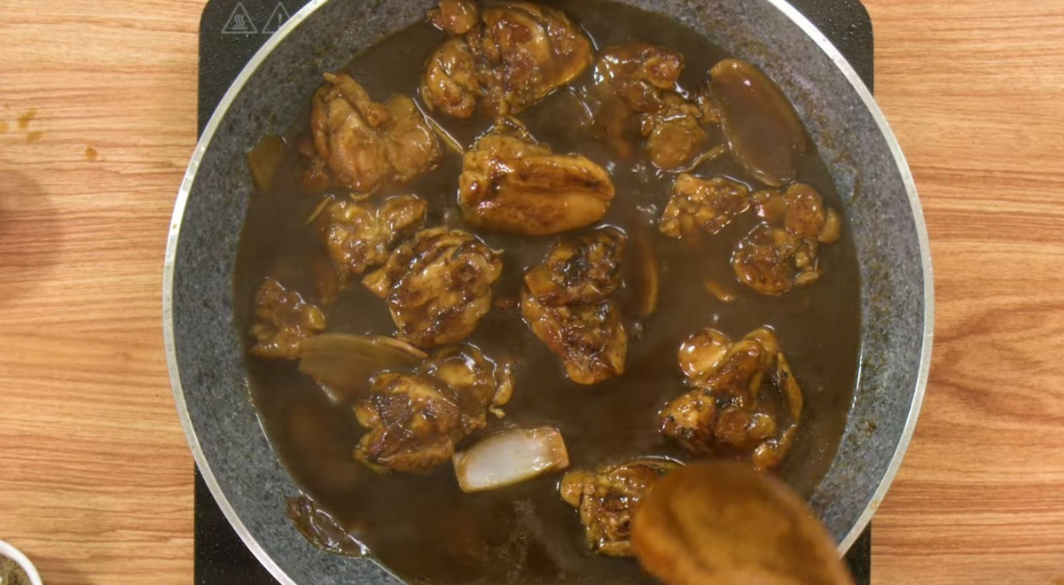 - En la misma sartén, saltear la mitad de la cebolla roja con láminas de kion y ajo molido (echar más aceite si es necesario). Agregar unas cinco cucharadas de sillao y verter un chorro de agua. Regresar los trozos de pollo y mezclar bien. Adicionar dos cucharaditas de aceite de ajonjolí y una cucharadita de salsa de ostión. Echar sal al gusto.