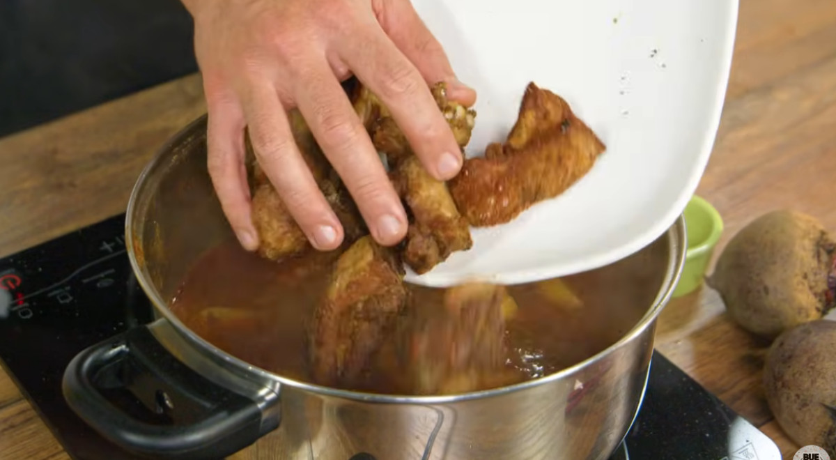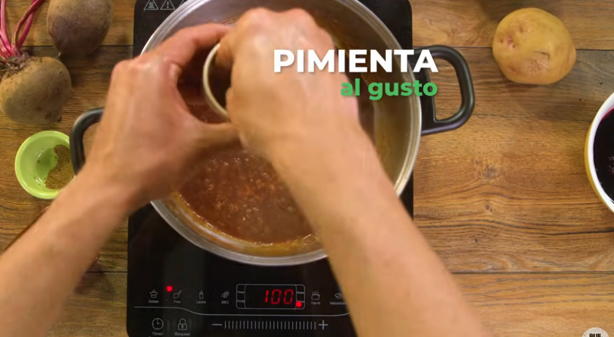 - Cuando las papas estén casi listas, incorporar el chicharrón y verter la beterraga licuada poco a poco, hasta alcanzar el tono rojizo deseado. Dar un último hervor y retirar del fuego.