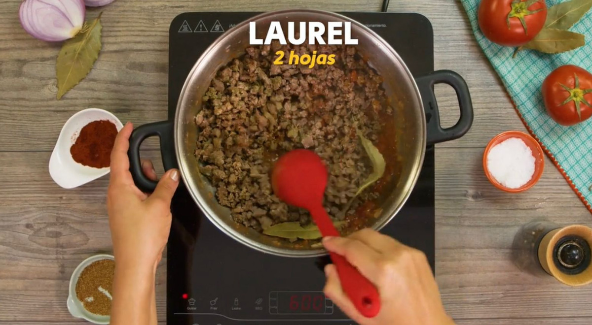 - Aparte, preparar un aderezo con la cebolla, el ajo, el ají panca y el tomate. Agregar 1⁄4 de taza de agua, la carne sellada, la sal, el orégano, el comino, el pimentón, la pimienta y el laurel. Cocinar por 10 minutos. Agregar las pasas y retirar del fuego.