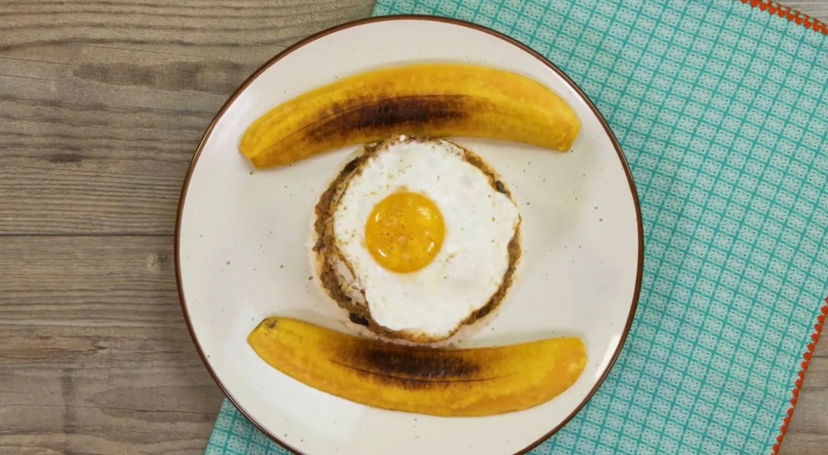 - Servir cada porción con ayuda de un molde individual: colocar una capa de arroz, otra de relleno y otra de arroz. Acompañar con huevo y plátano fritos.