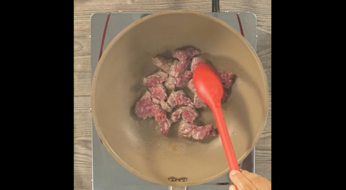 - Colocar la carne de res en la sartén y flambear.