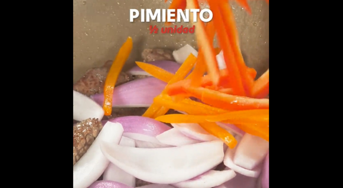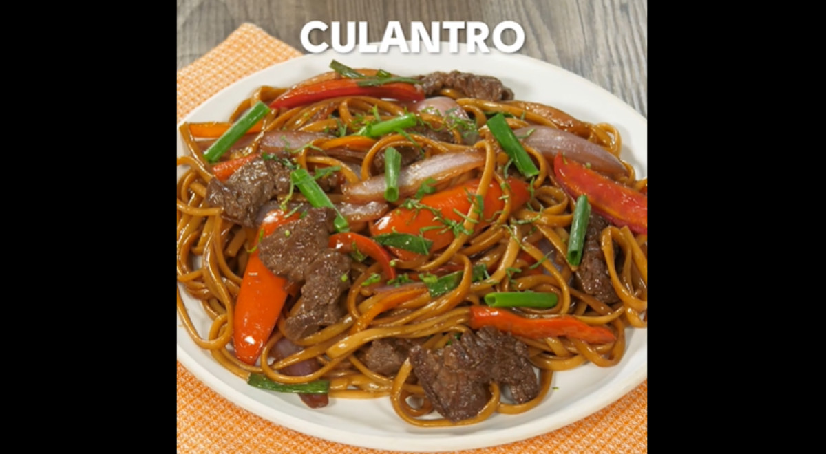 Esta receta lleva cebolla, ají amarillo, cebolla china, pimiento, tomate, vinagre, salsa de ostión, culantro, tallarines y carne de res.