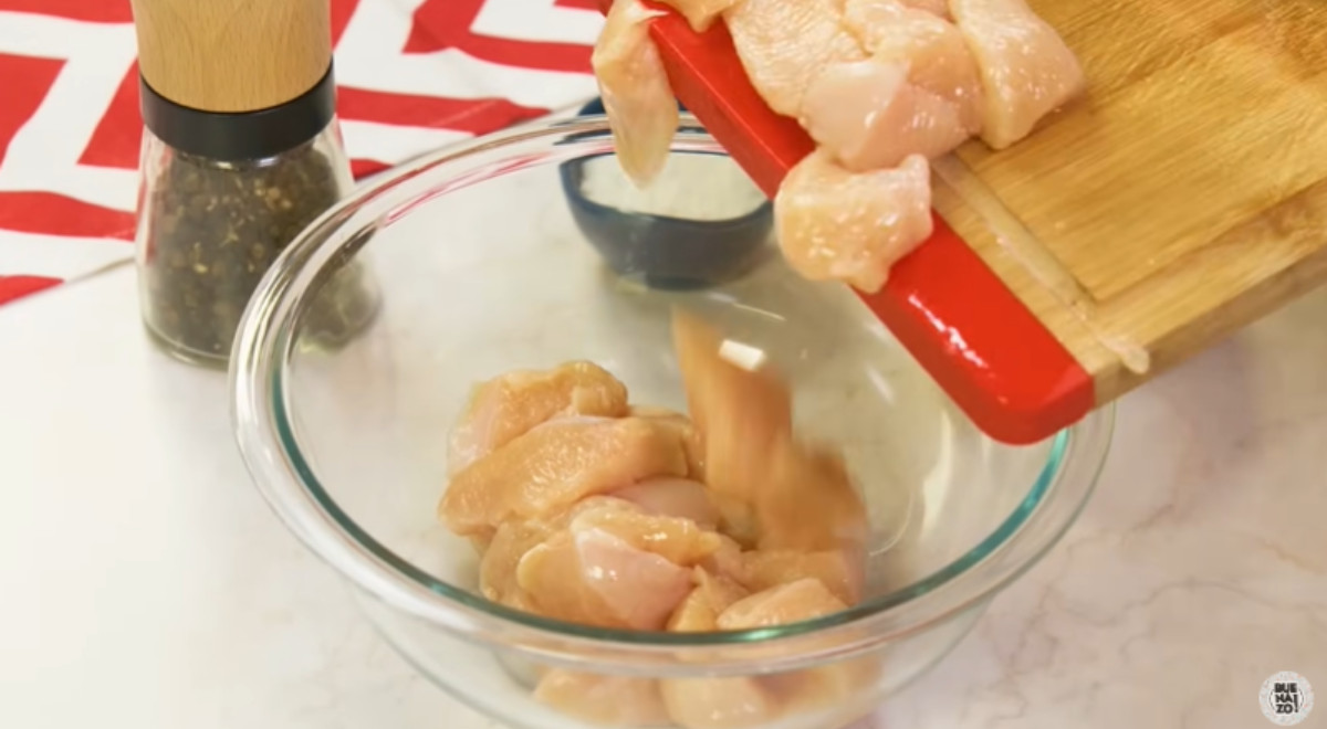 2 porciones- Salpimentar los trozos de pollo, cubrirlos con 1 cucharada de chuño y freírlos en una sartén tipo wok. Reservar el pollo.