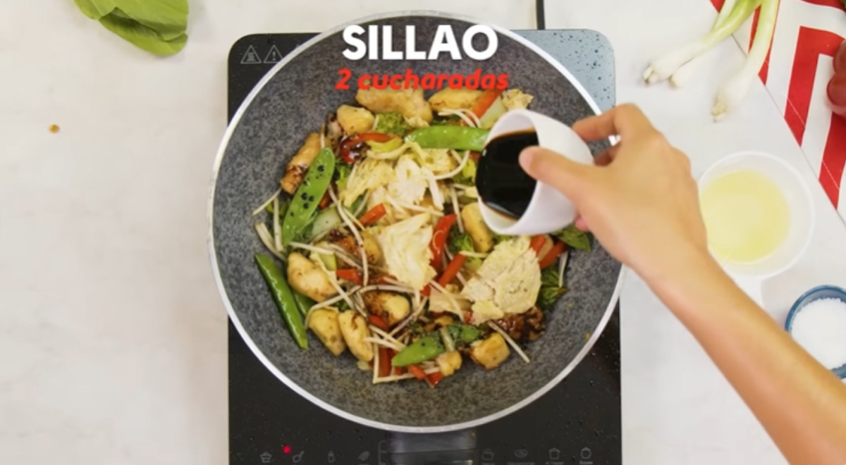 - Agregar el pollo reservado, el sillao, la salsa de ostión, sal al gusto, el aceite de ajonjolí, el caldo de pollo y el azúcar. Seguir salteando.