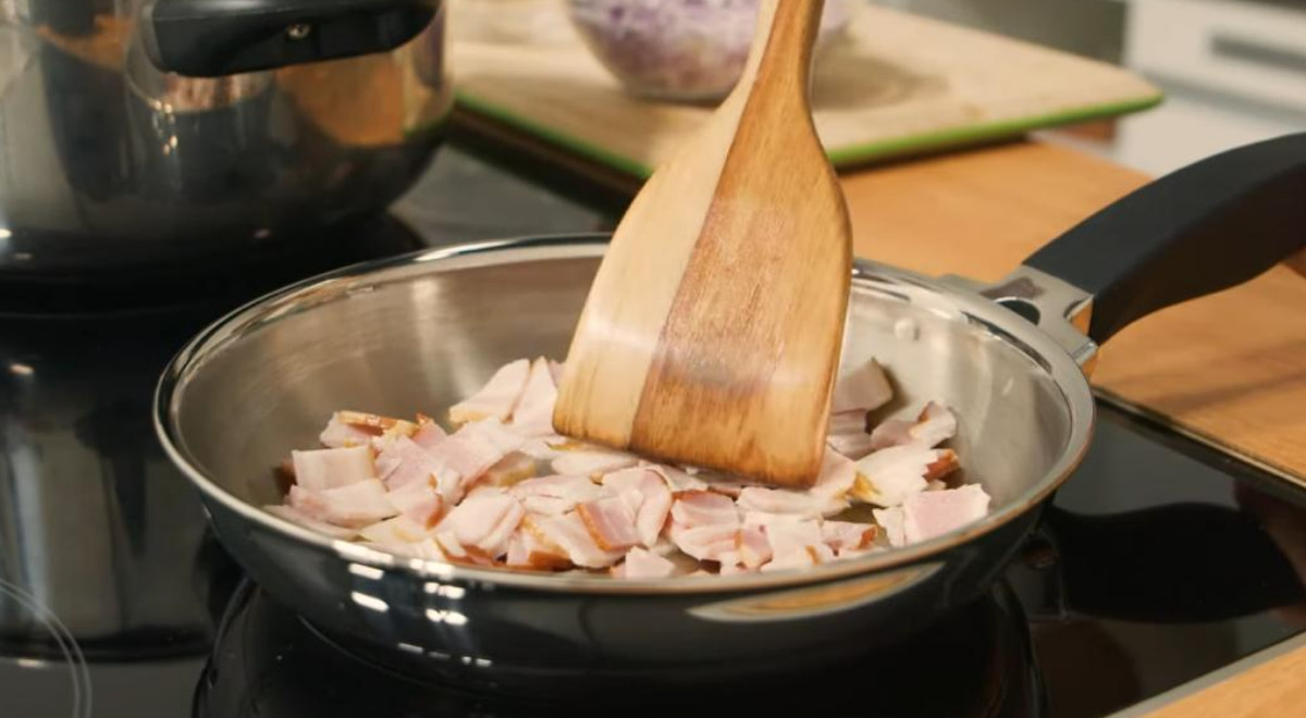 - Dore el tocino en una sartén a fuego medio. Añada la cebolla, el ajo y el ají y fría por cinco minutos. Sazone con el culantro, el comino, sal y pimienta y cocine por dos minutos.