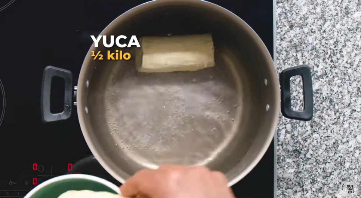 4 porciones- Cocer la yuca en agua con sal de 20 a 25 minutos o hasta que esté suave. Retirar del agua y reservar.