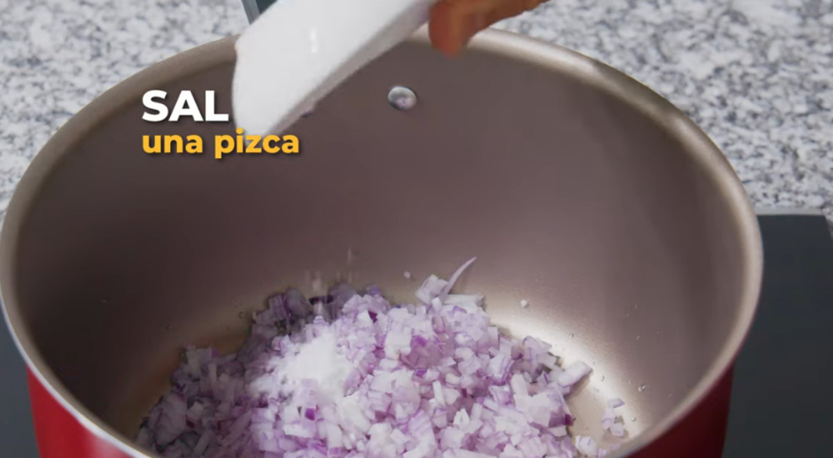 - Calentar un chorro de aceite en una olla. Agregar la cebolla en cuadraditos y sofreír hasta que esté dorada. Añadir el ajo molido y seguir sofriendo por un par de minutos más.
