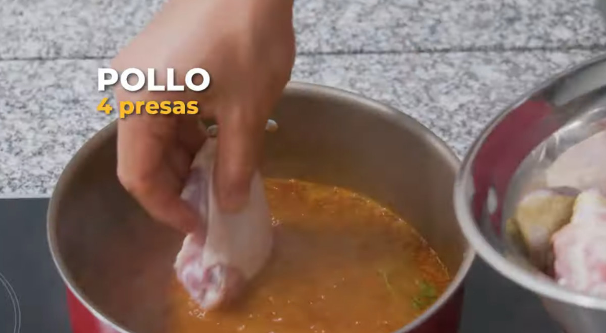 - Incorporar las presas de pollo, tapar la olla y cocinar de 20 a 25 minutos o hasta que el pollo esté cocido.