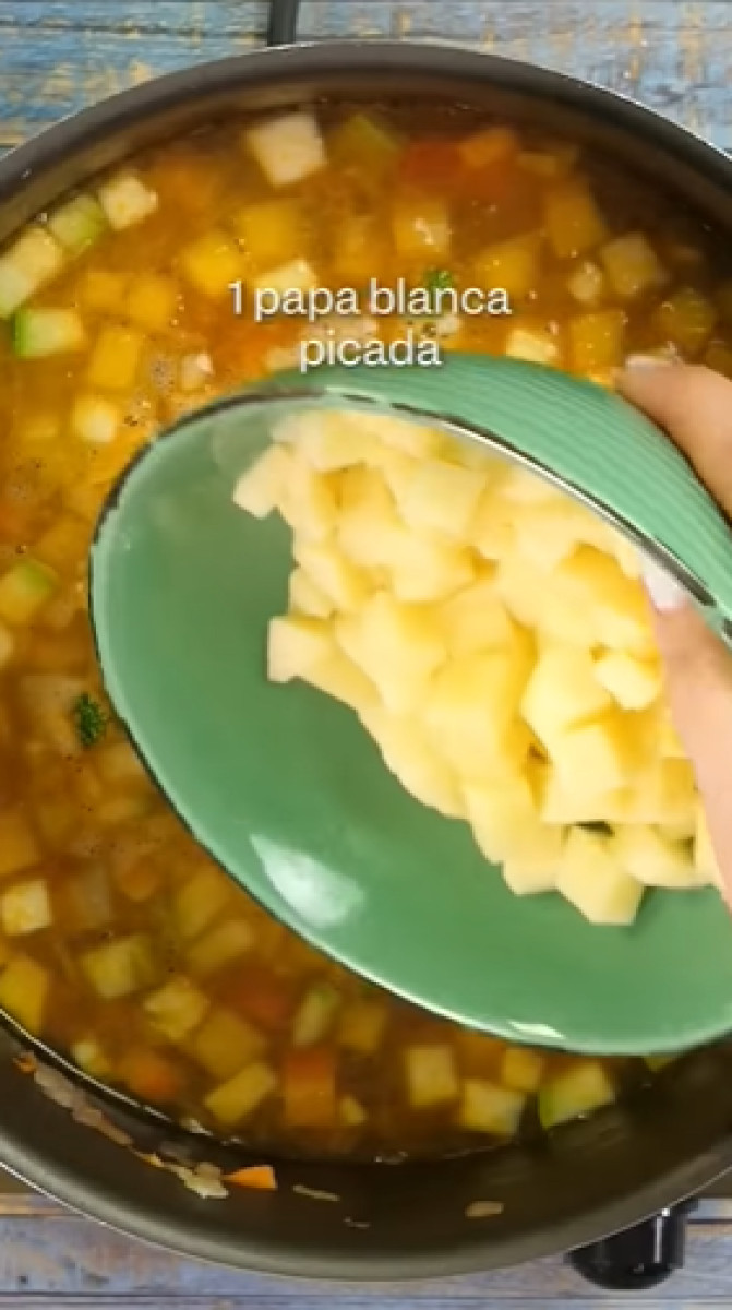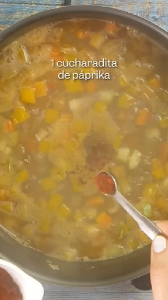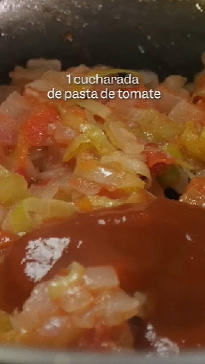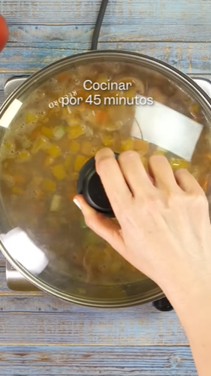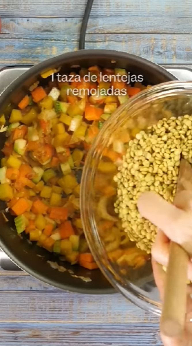La base es hacer un buen sofrito con cebolla y ajo. Luego agrega tomate, poro, zapallo, zanahoria, zapallito italiano, pasta de tomate y apio. Después vierte la lenteja y mezcla.