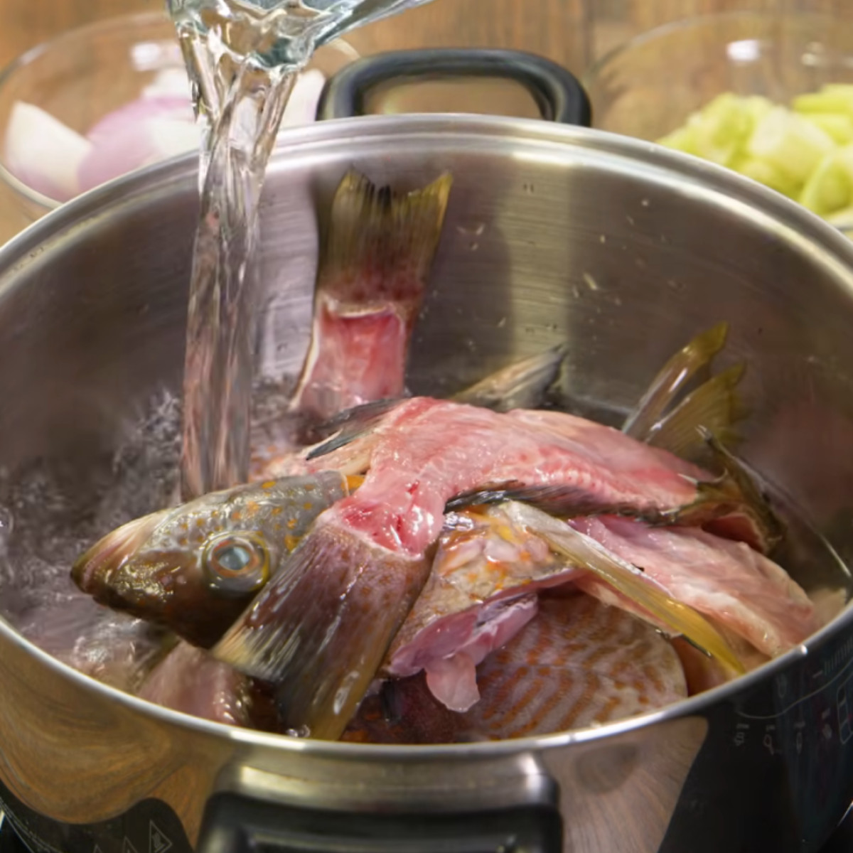 - Cuando el caldo esté listo, colar y colocar en una olla limpia. Añadir el pescado en trozos, sal al gusto y la cebolla en juliana. Dejar cocinar hasta que el pescado esté cocido.