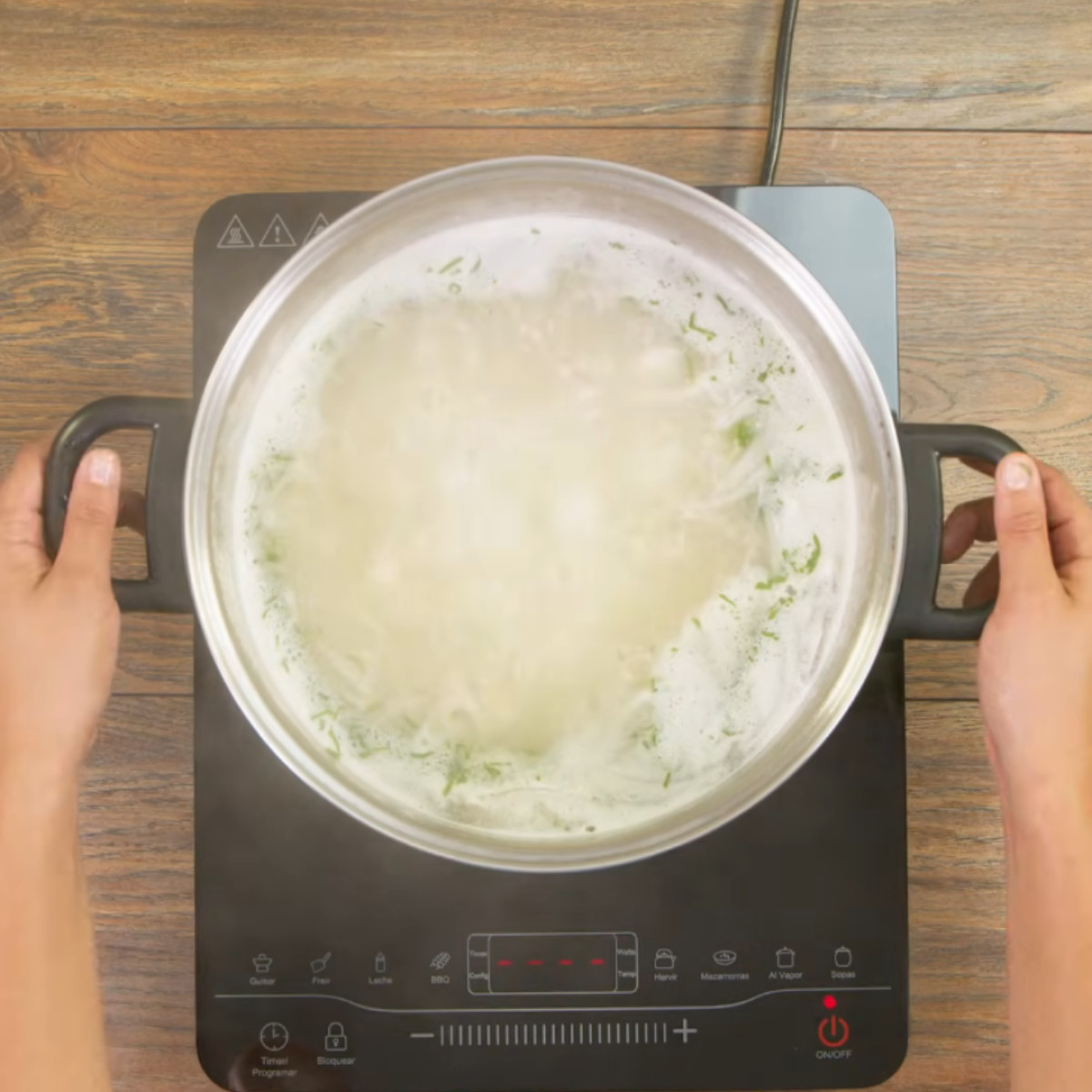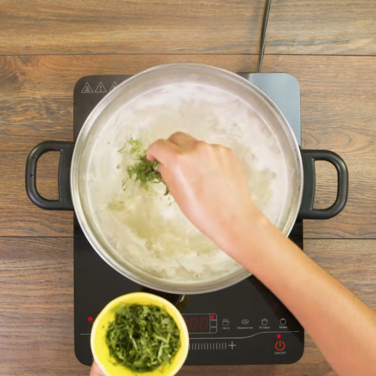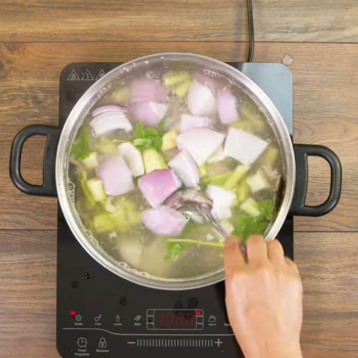 - Agregar las ramas de culantro, el kion, los dientes de ajo, el apio y la cebolla. Dejar hervir por 45 minutos a fuego medio. Presionar los ingredientes durante la cocción para que suelten todo su sabor.