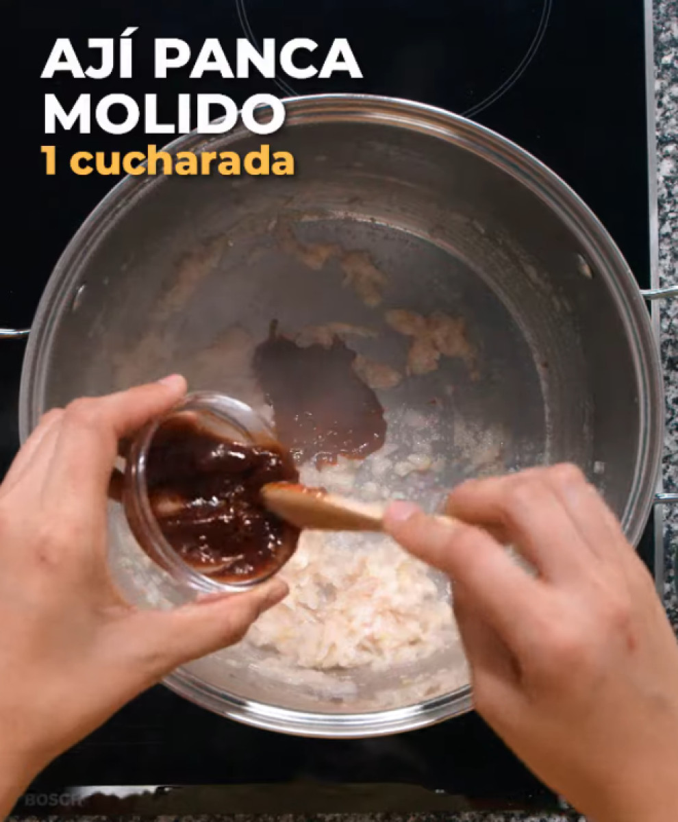 - Calentar aceite en una olla. Freír la cebolla, el ajo, el ají panca y la pasta de tomate. Añadir la quinua lavada y escurrida. Mezclar bien con el aderezo. Verter el agua, mover y dejar hervir.