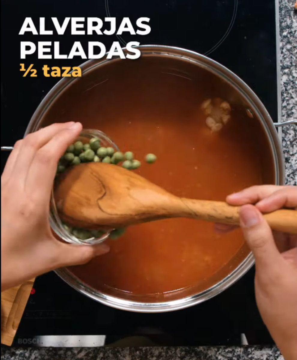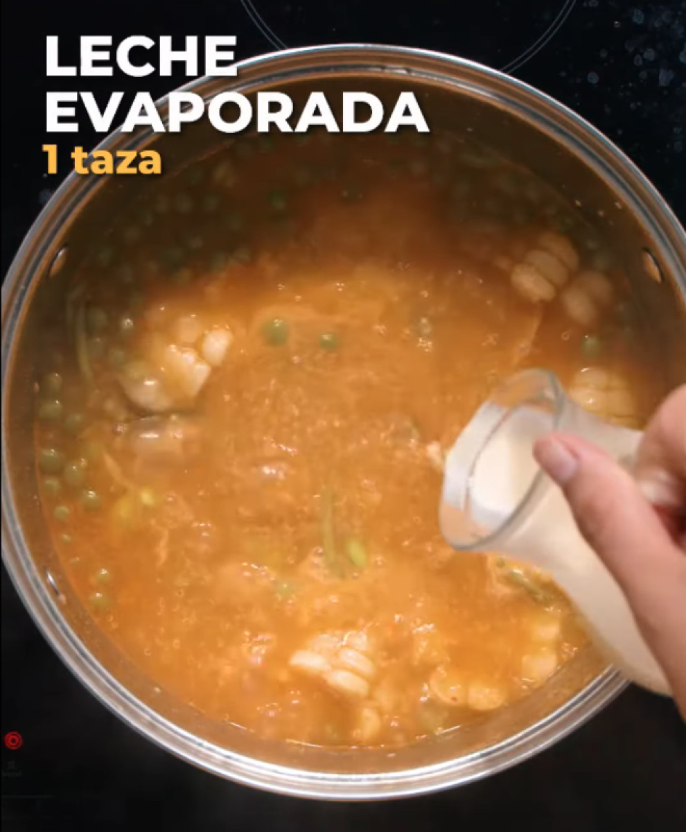 - Echar la leche evaporada y retirar las ramas de huacatay.